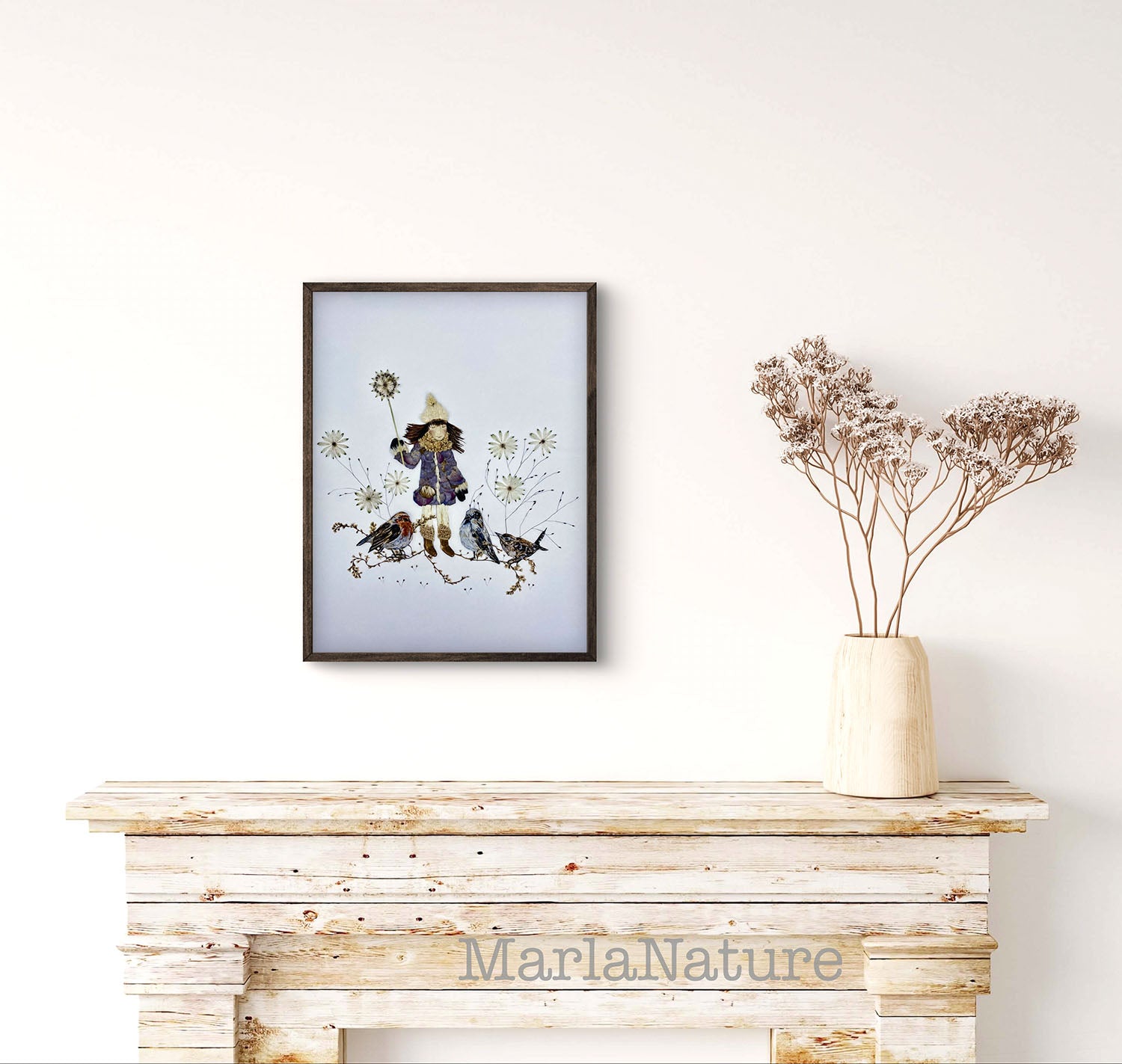 Die Collagenillustration ,, Das Wintermädchen " mit den Gartenvögeln Rotkelchen, Spatz und den kleinen Zaunkönig ist eine überarbeitete Arbeit die ich Anfangs als Installation veröffentlicht habe. Das Motiv spricht jeden Garten- und Vogelfreund an. Den was gibt es schöneres als diese drei netten Gesellen in den Wintermonaten an Futterstellen beobachten zu können.