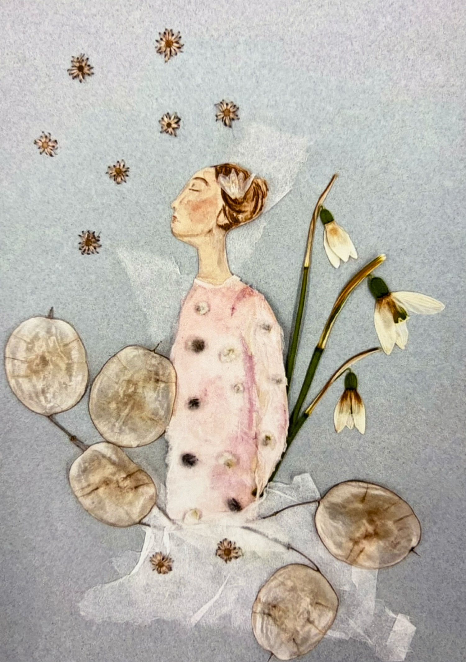 Verwendet wurde für die Illustration gepresste Schneeglöckchen, Silberblatt, einzelne Weidenkätzchen und chinesisches Seidenpapier.