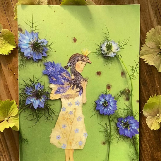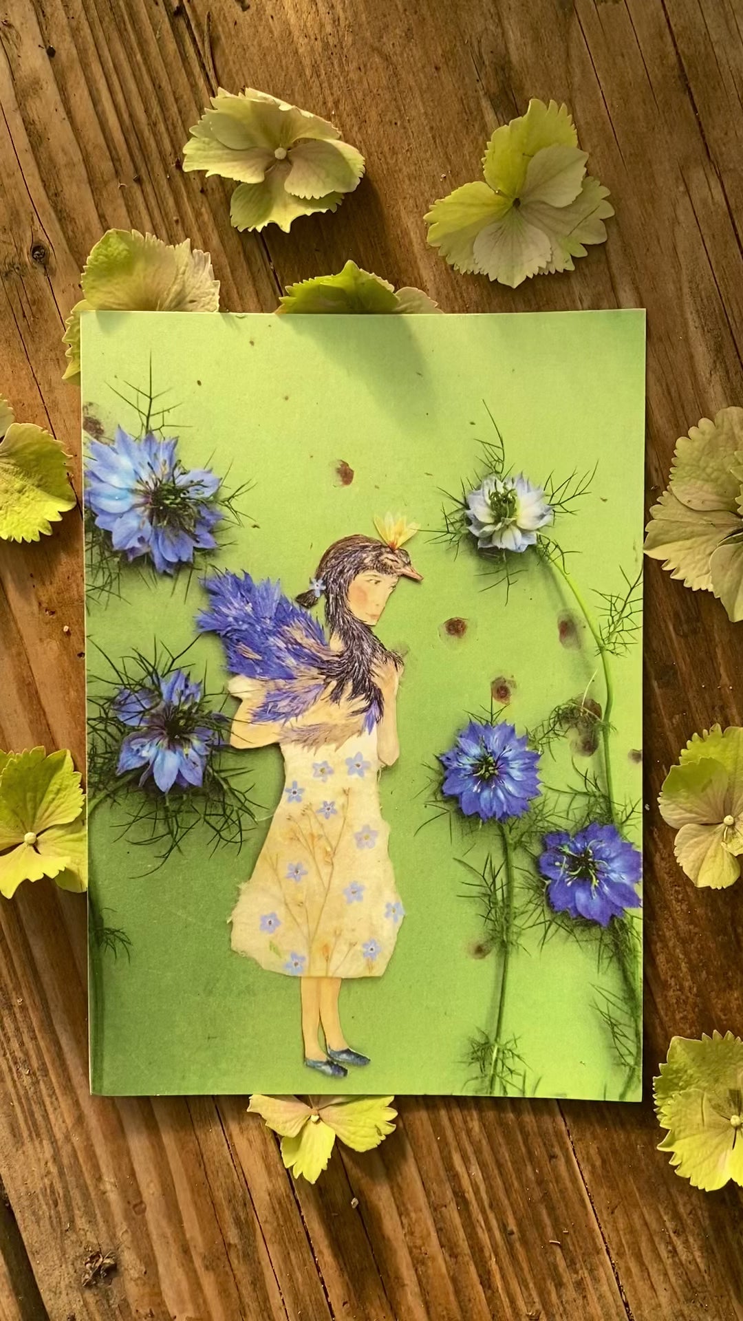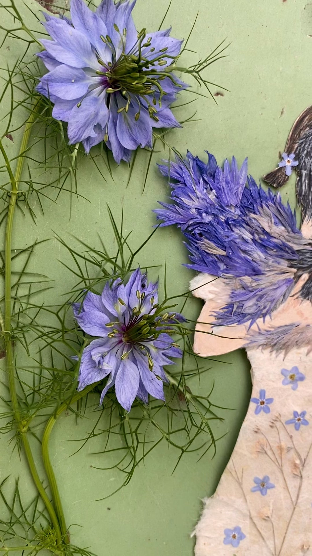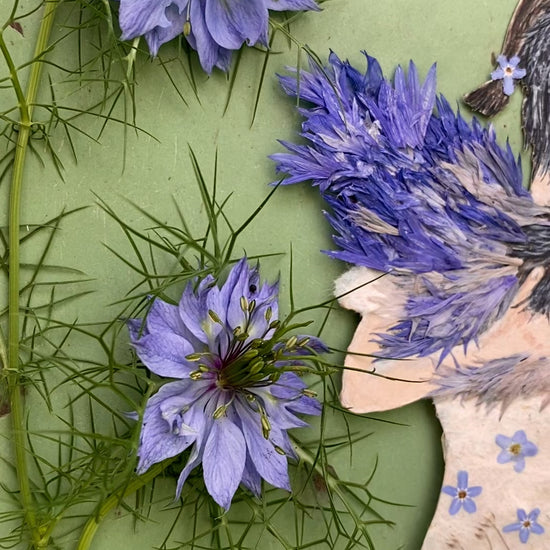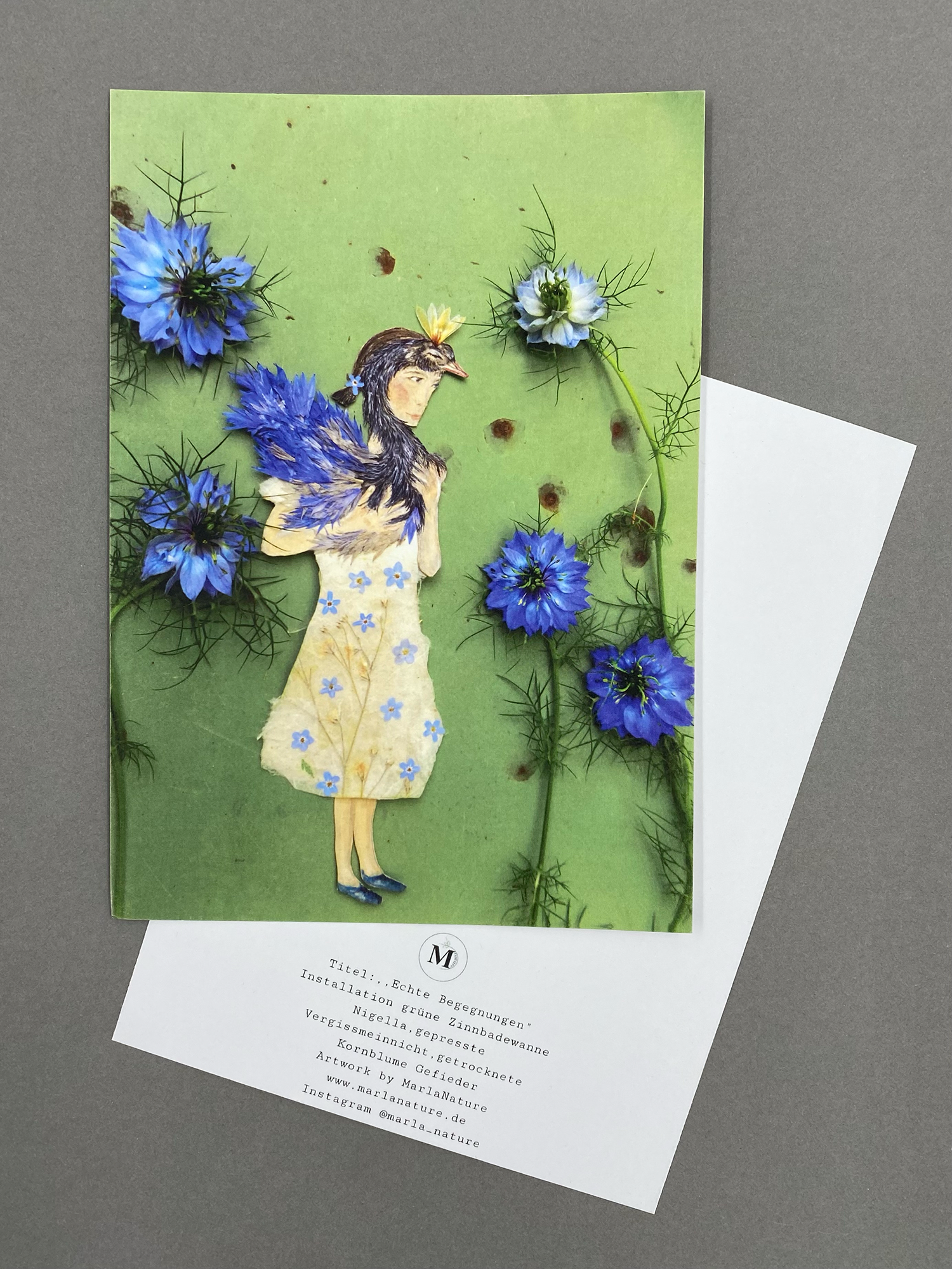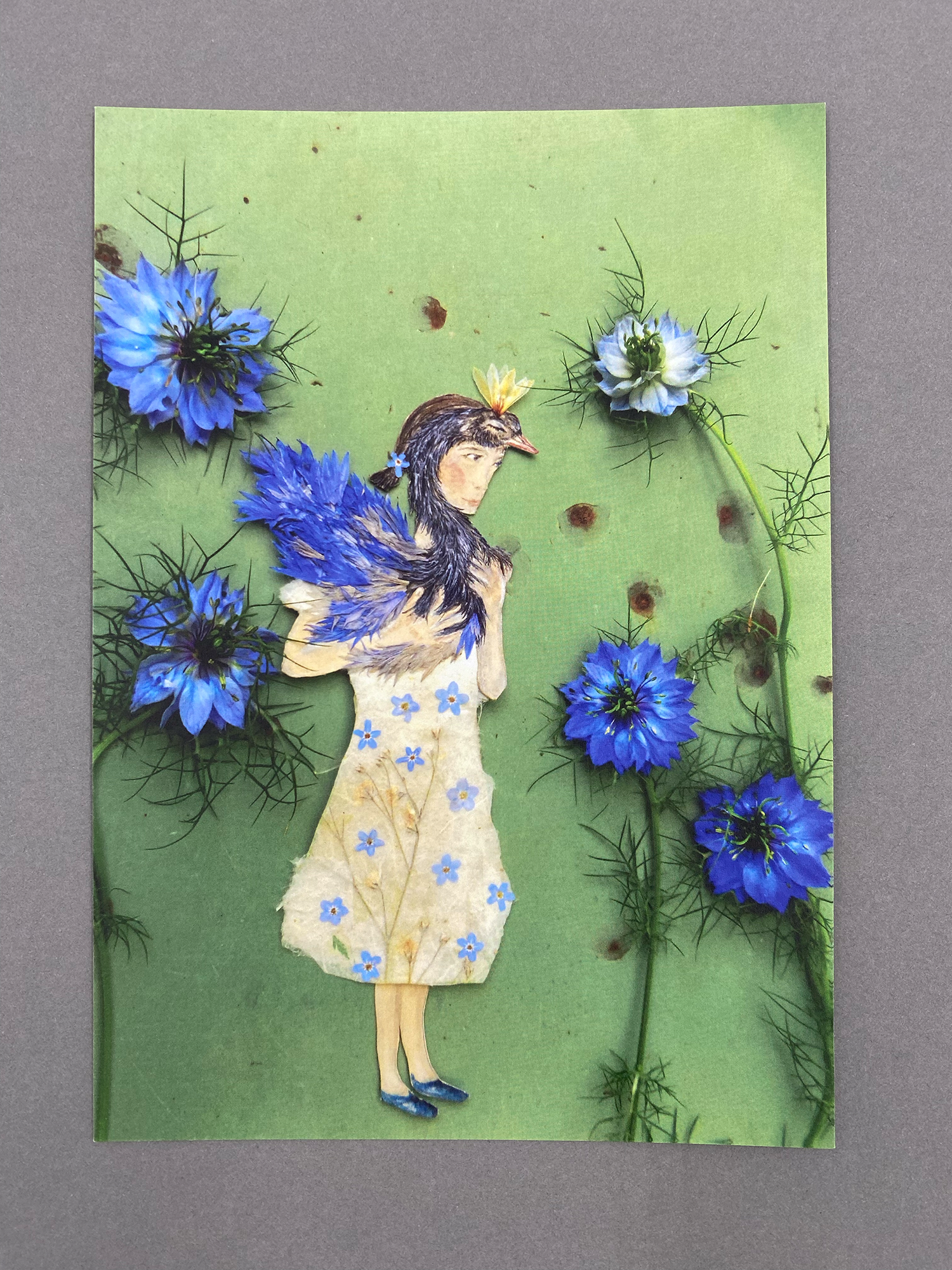 Auch hier hab ich meine alte grüne Zinkbadewanne als Medium genutzt. Nigella in den herrlichen Blautönen wirken für den Hintergrund sehr plastisch und locker. Das Gefieder des Schwanenvogels ist aus einzelnen getrockneten Kornblumen Blütenblätter geklebt. Das Kleid aus japanischen Seidenpapier und mit sorgfältig gepressten Blüten des Vergissmeinnicht verziert.