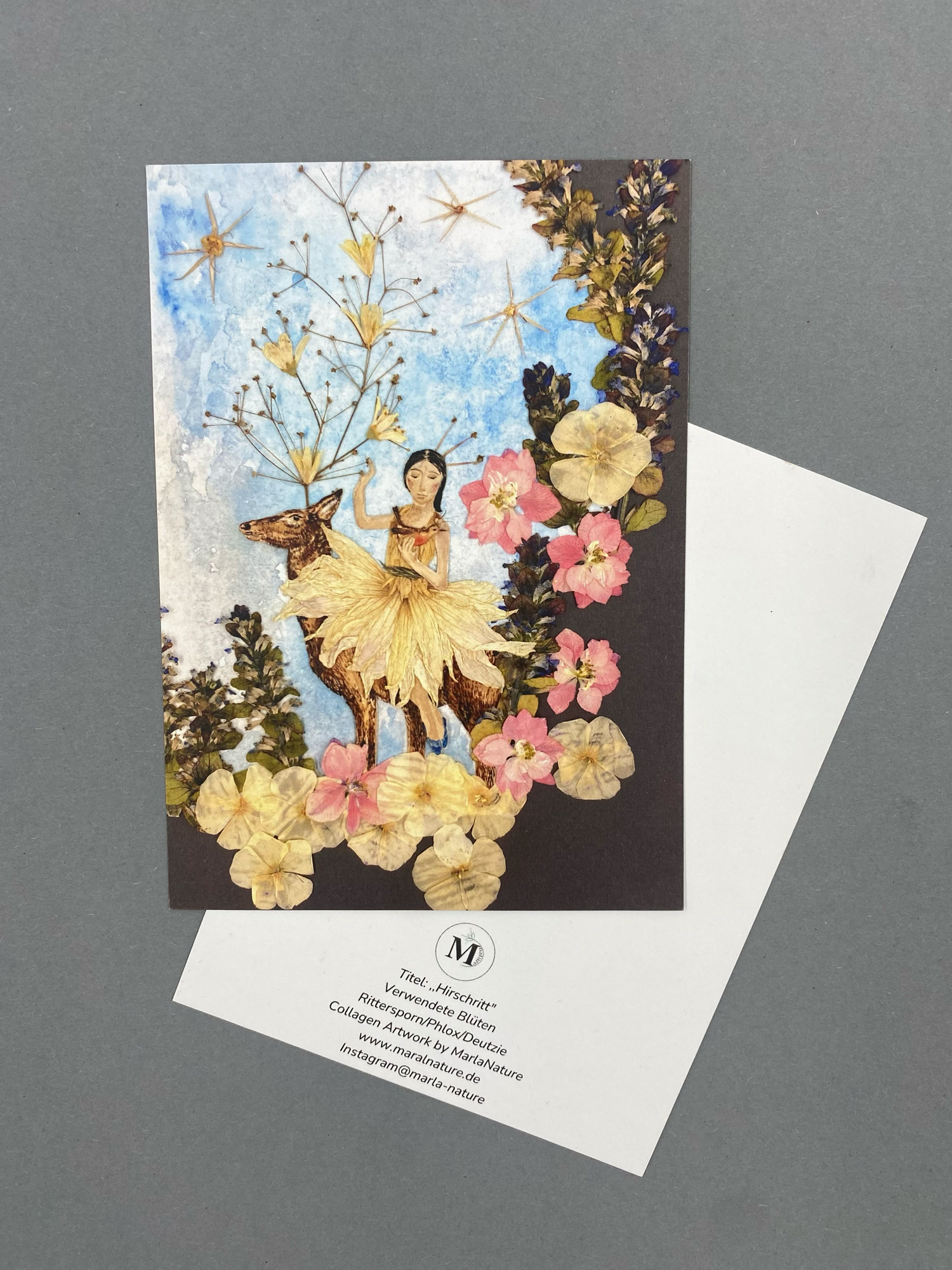 Filigran kommt sie auf ihren Hirsch angeritten umgeben von gepressten Blüten des Rittersporn,Phlox und die kleinen zierlichen Blüten der Deutzie.Das Motiv ist nicht nur für die weihnachtliche Stimmung sondern kann für das ganze Jahr verschenkt, gesammelt oder eingerahmt werden.