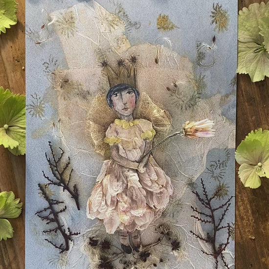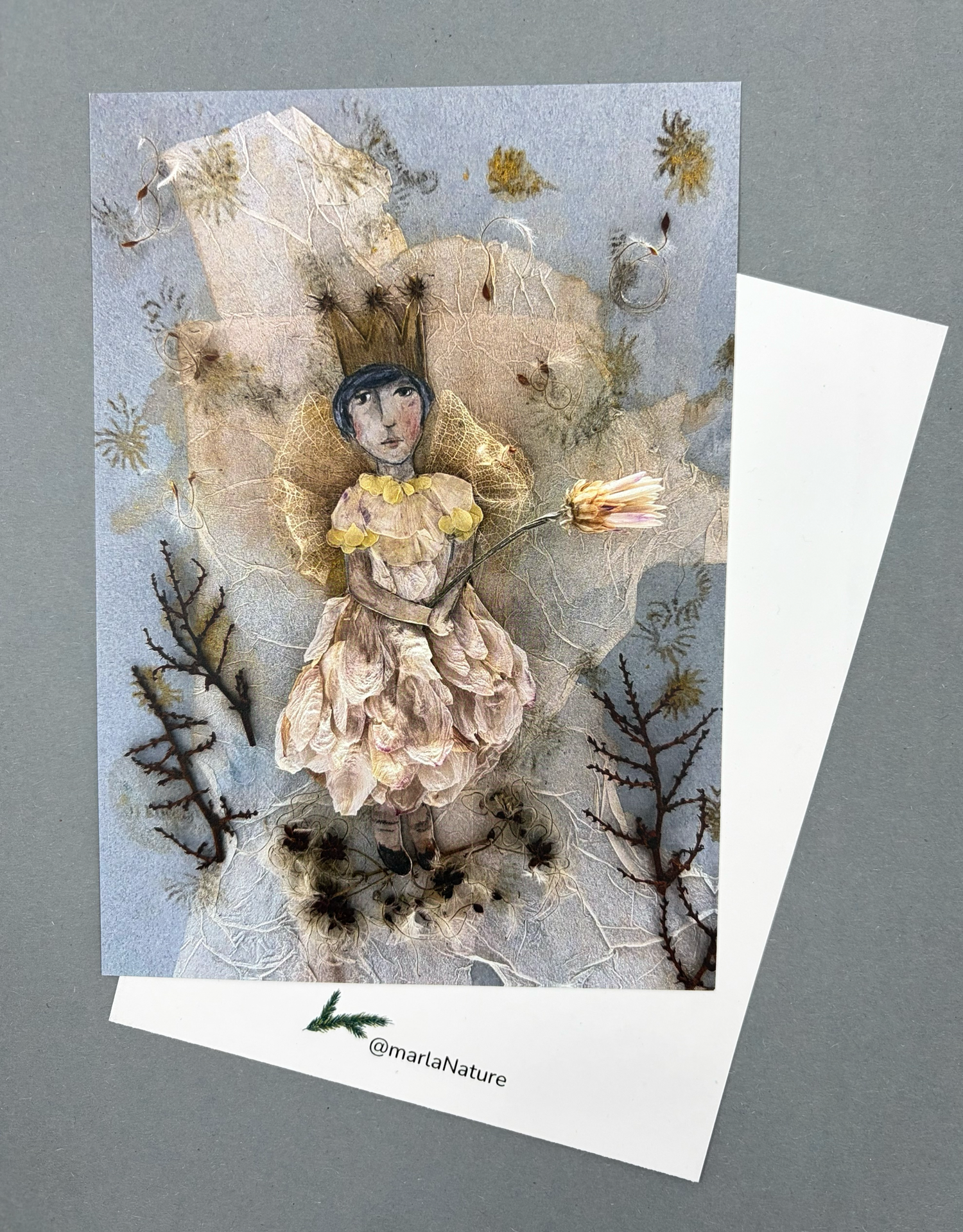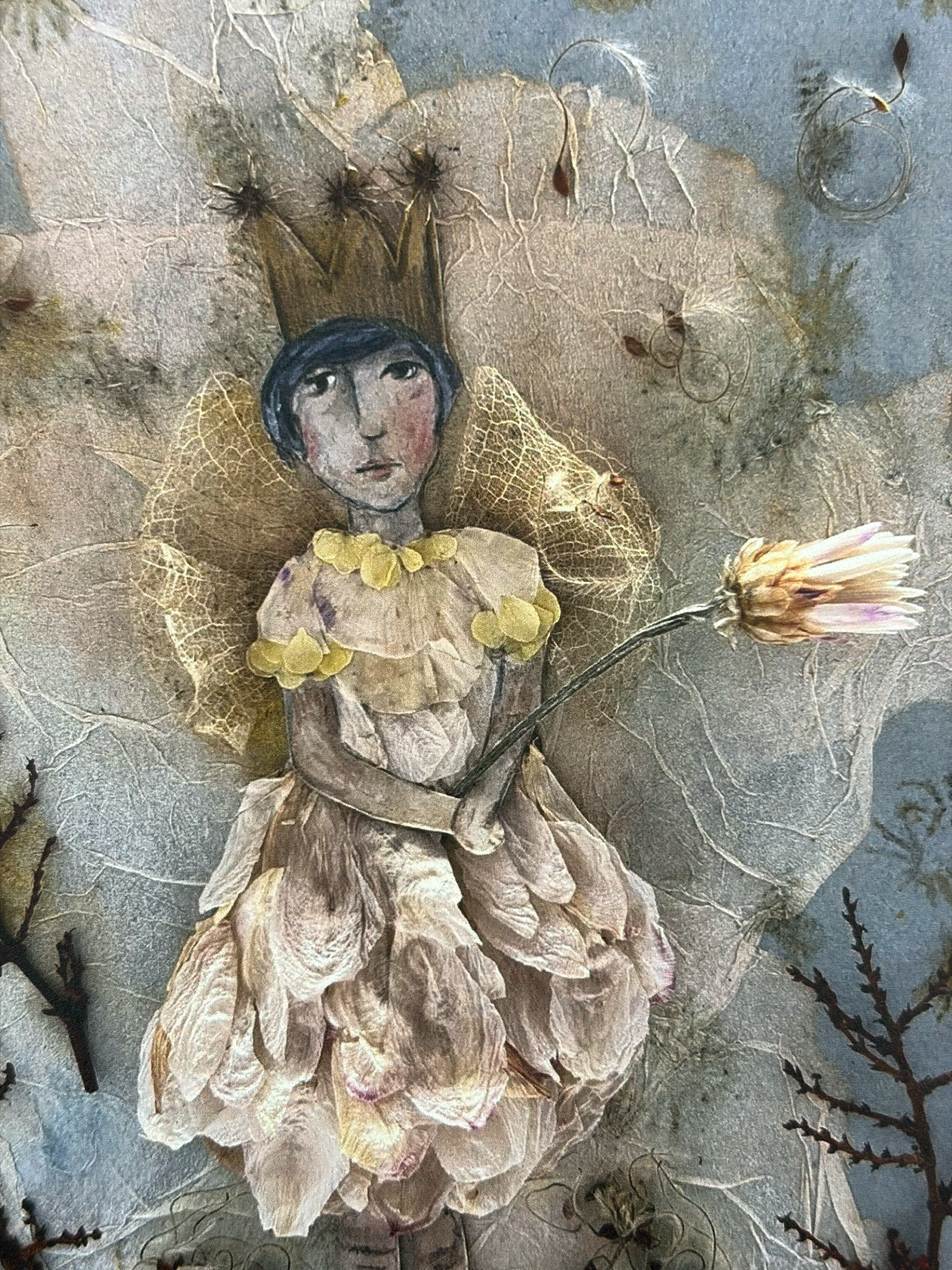 Im Atem des Winters ist der trägt der kleine Engel ein Kleid aus getrockneten Tulpenblättern verziert mit kleinen Blüten des Schneeballs.Die zarten Flügel sind aus den Blütenkelch der Lampionblume nach der Reifezeit gestaltet.