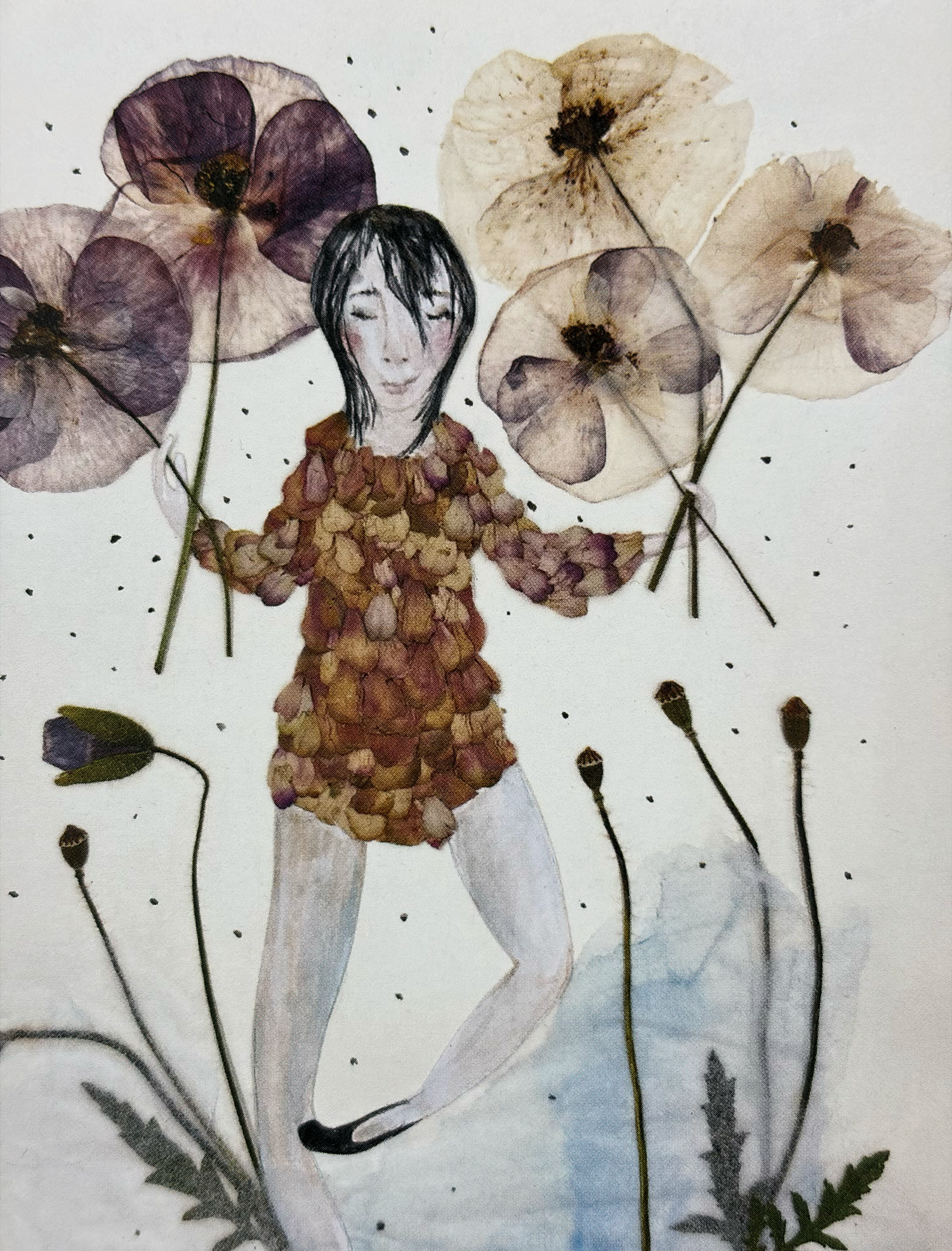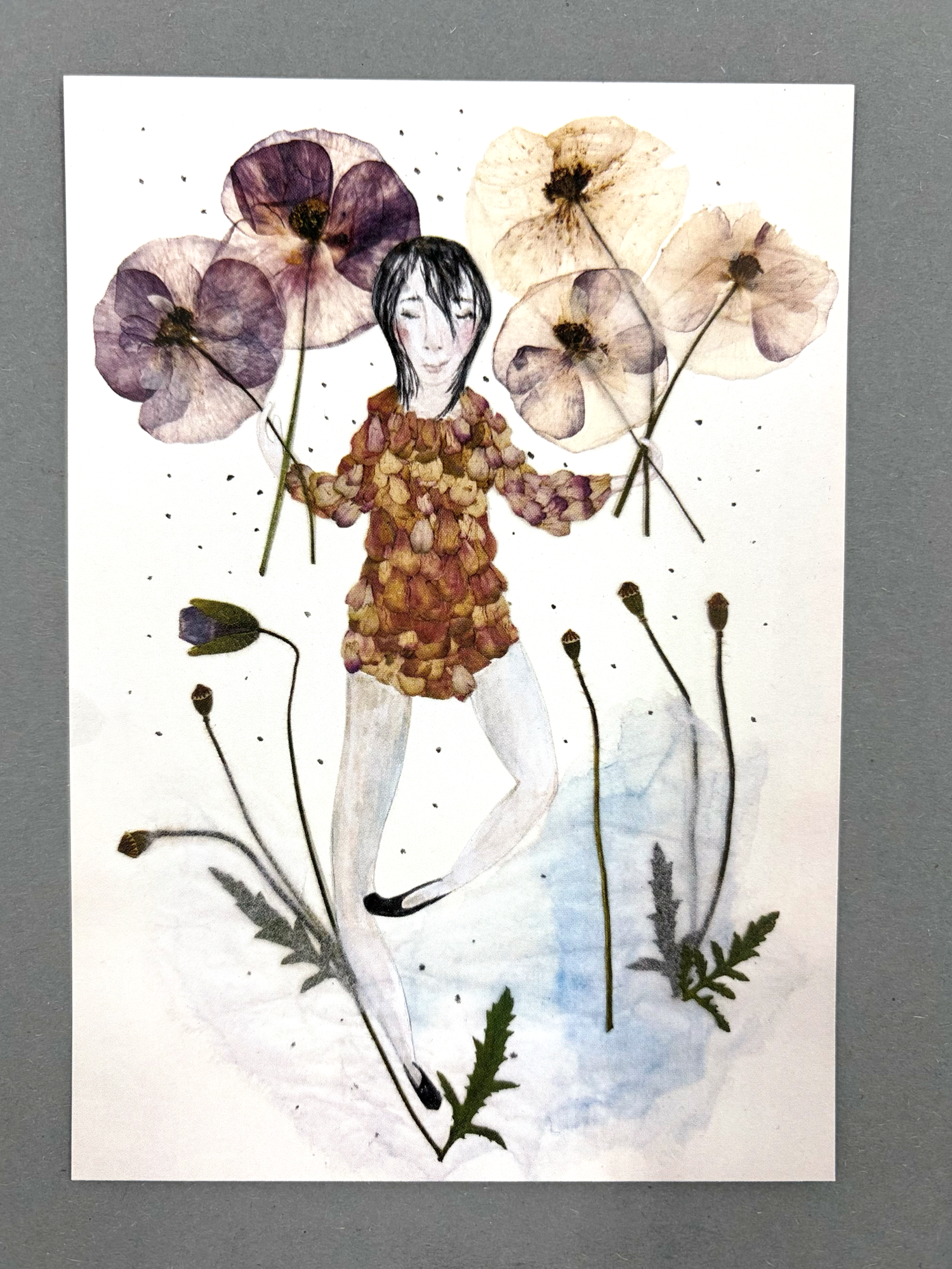 Seidenmohn halten nicht nur ein paar Tage in der Vase sondern lassen sich auch wunderbar Pressen.Ihre Blütenblätter fühlen sich wahrhaftig wie Seide an und zieren in dieser Collage den Hintergrund.Der Body des tanzenden Mädchens ist aus einzelnen Zinnien-Blüten-Blätter zusammengefügt.