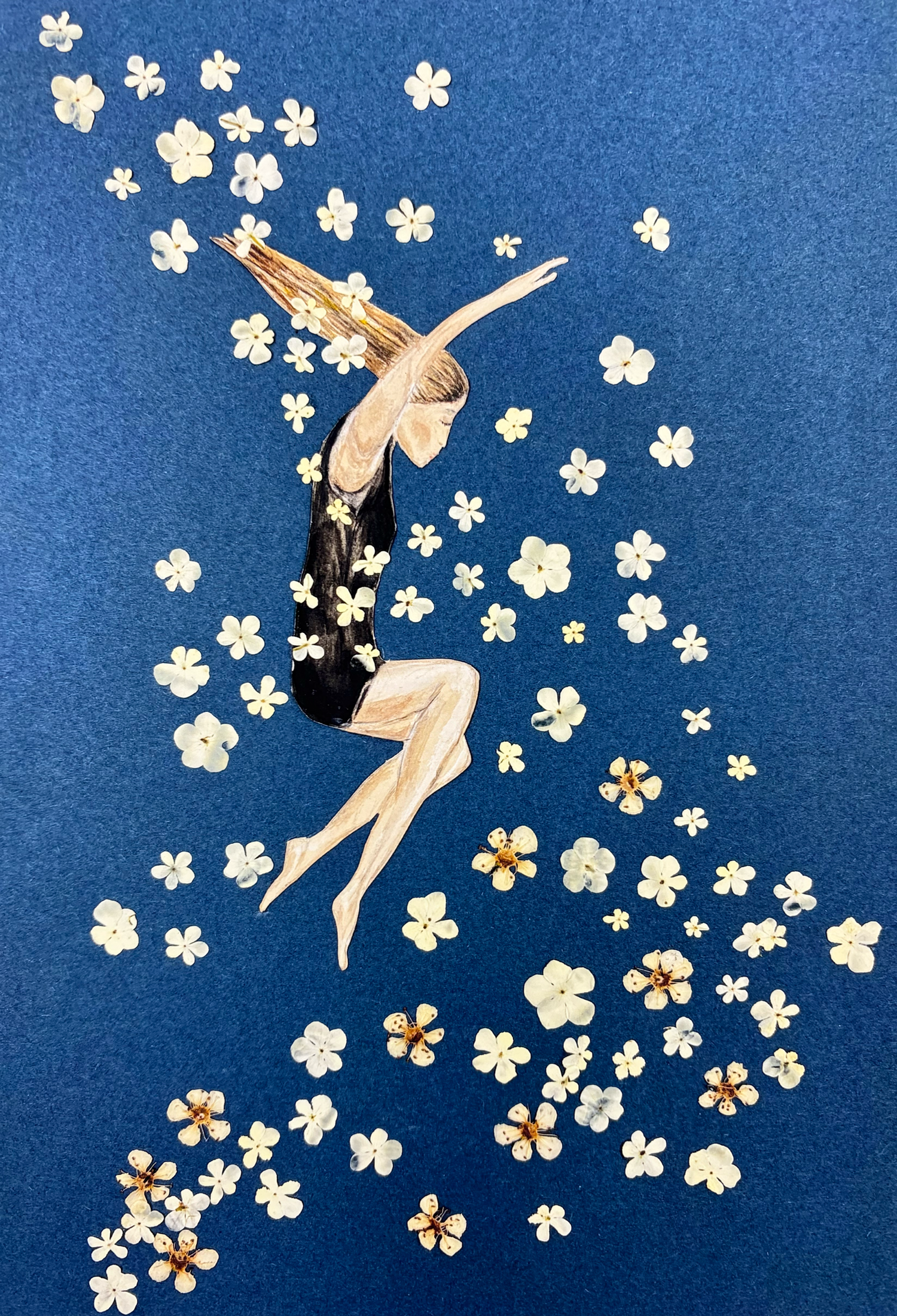 Der Sprung geht in einen Wirbel von gepressten Blüten des Schneeballes und den zarten Blüten von Weißdorn.